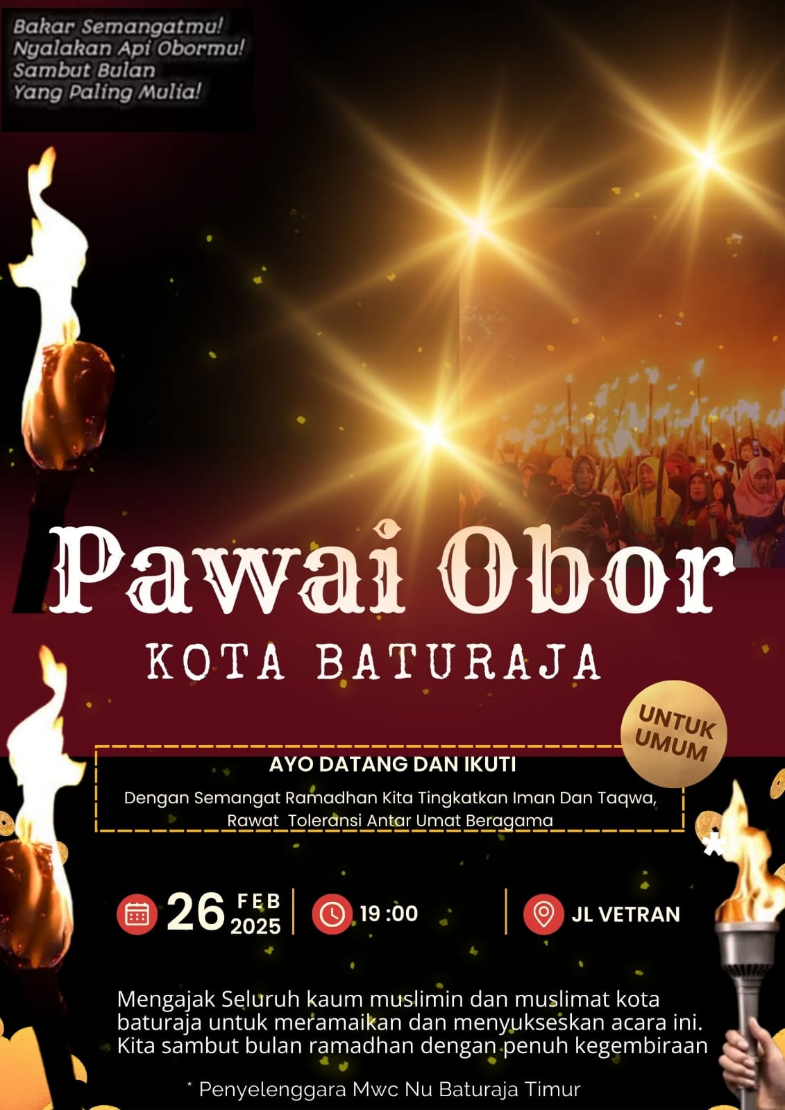 Dengan semangat kebersamaan, MWC NU Baturaja Timur mengajak seluruh warga muslim dan muslimat di Kabupaten OKU untuk turut serta dalam pawai obor dan gebyar sholawat ini sebagai bentuk penyambutan yang penuh sukacita terhadap bulan Ramadhan 1446 H. (Red)