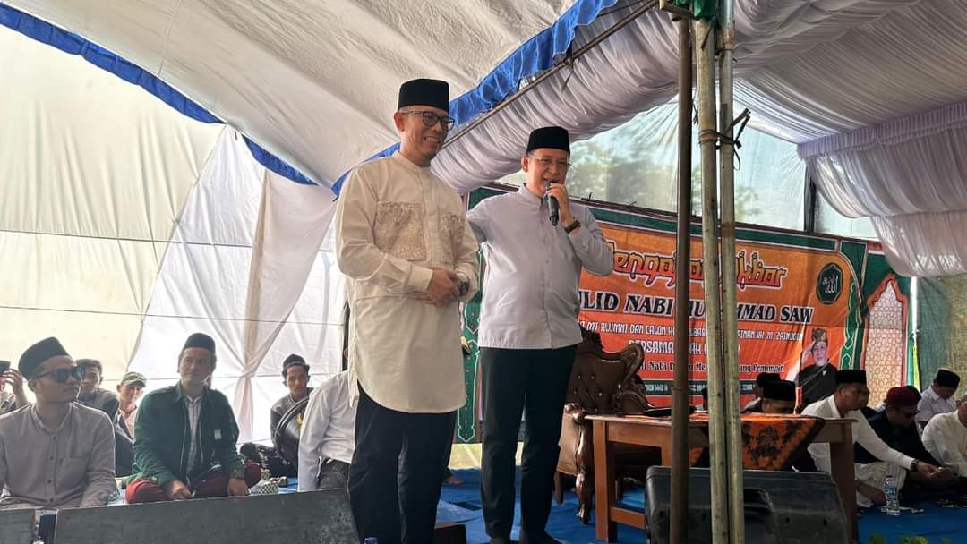 Baturaja radjaberita.com – Pasangan Calon Bupati Ogan Komering Ulu (OKU) H Teddy Meilwansyah dan Calon Wakil Bupati Ir H Marjito Bachri hadiri acara Pengajian Akbar dalam rangka memperingati Maulid Nabi Muhammad SAW. Acara yang diadakan oleh Majelis Taklim Alumni dan calon haji Albarokah, di bawah pimpinan KH M Zainudin dan Abah H Kirun, berlangsung di lapangan bola blok T, Desa Karya Mukti, Kecamatan Sinar Peninjauan, pada Senin (7/10/2024).